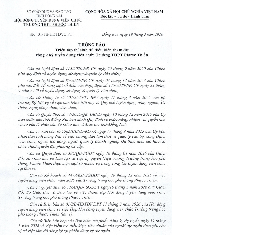 Thông báo triệu tập dự tuyển vòng 2 kỳ tuyển dụng viên chức Trường THPT Phước Thiền năm 2025 – 2026